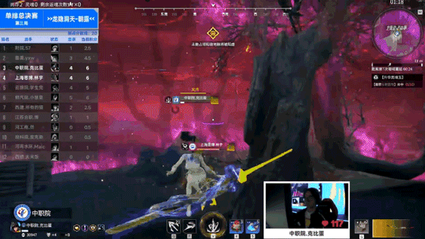 梅花桩阶段三足鼎立,中职院.克比蛋利用长剑秘籍夺得丝血鲁美.yxm的击败分,后残血面对满状态的上海思博.林宇也丝毫不惧,开启奥义局势瞬间逆转,一个刀袭将其砍飞至暗域,赢得本局天选!