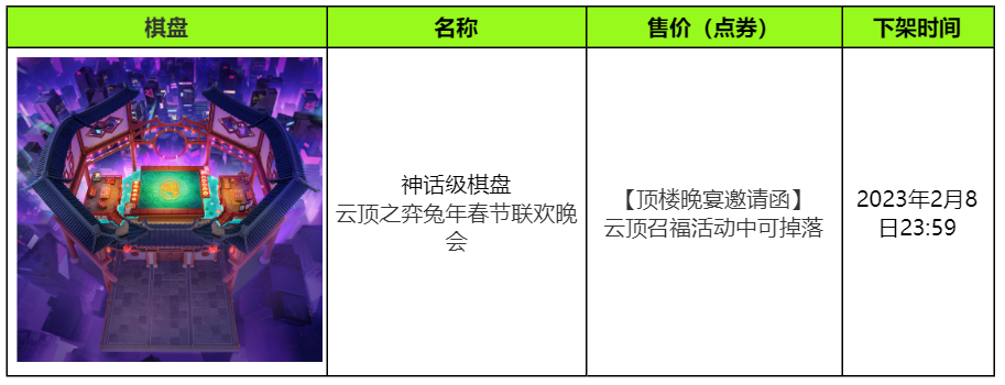 l 如玩家当前大区未拥有神话级棋盘云顶之弈兔年春节联欢晚会,在该界面第61次点灯召福时,必得神话级棋盘 云顶之弈兔年春节联欢晚会。