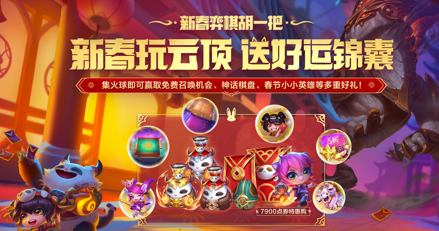 在云顶召福活动中,可消耗点券兑换灯笼优先召唤春节版本小小英雄,并有概率获得三款兔年春节限定神话级道具,“你看见过我的胖达吗?” 小小安妮,云顶之弈兔年春节联欢晚会 棋盘,舞狮本狮 啵啵龙。