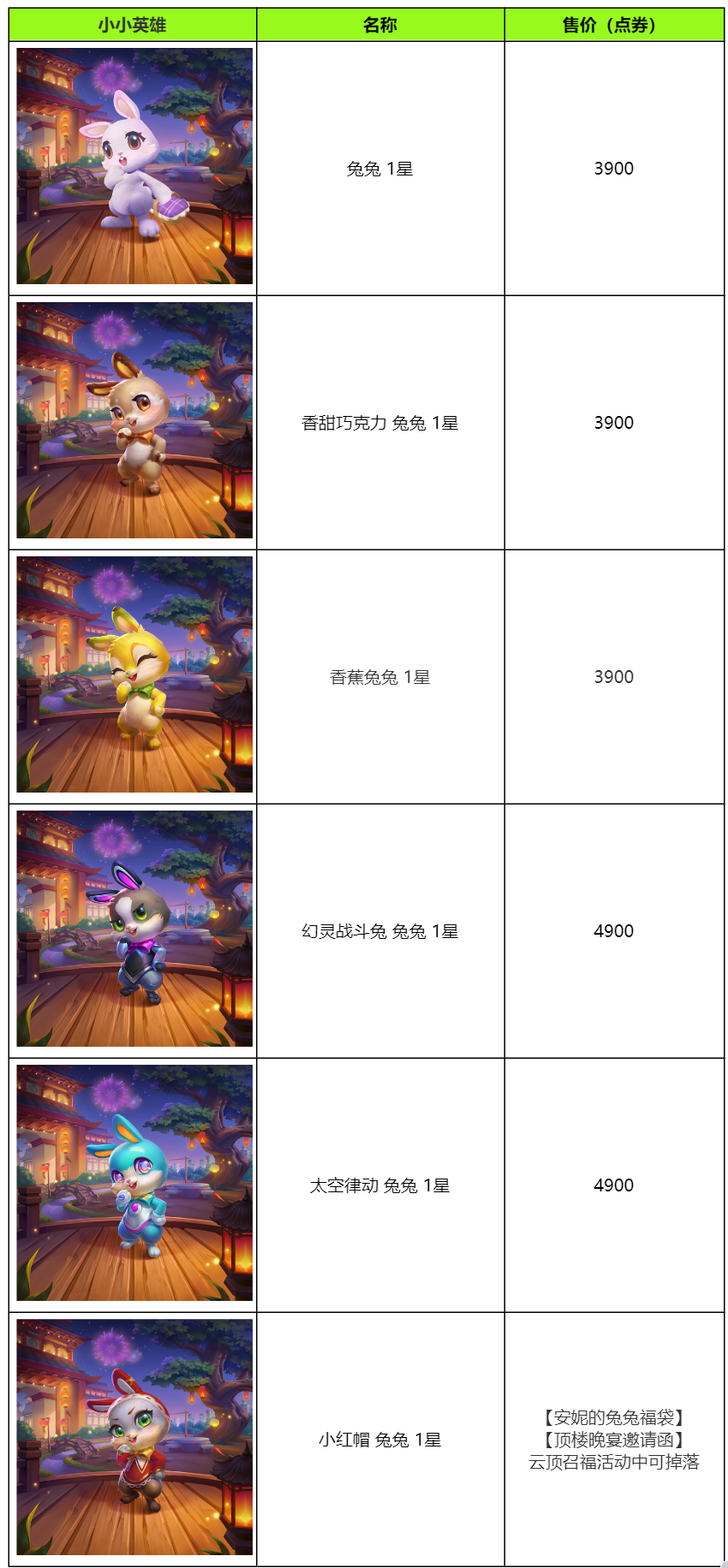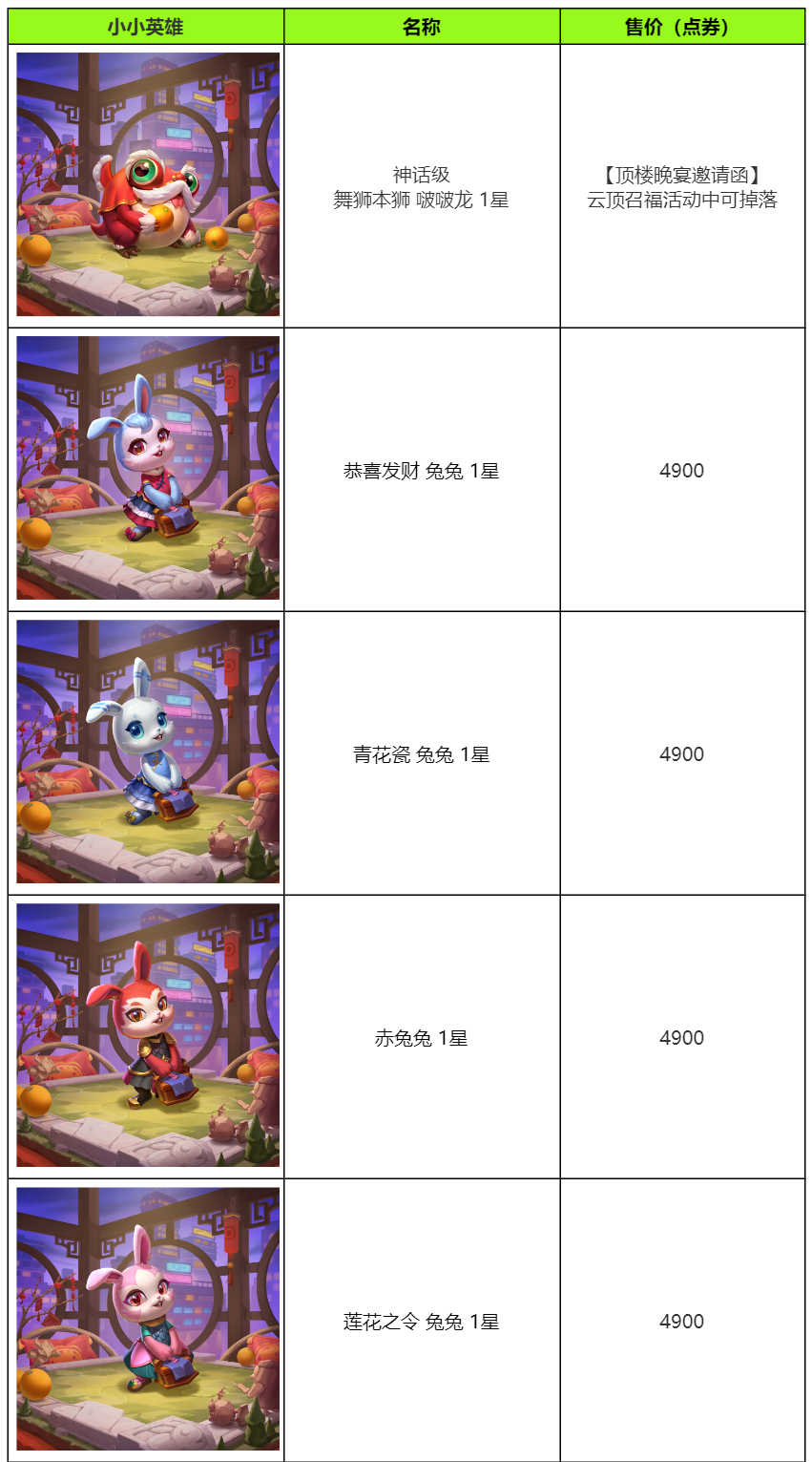 l 消耗灯笼点灯召福将召唤随机小小英雄,平均有2%概率获得神话级棋盘 云顶之弈兔年春节联欢晚会,有98%概率优先获得春节版本小小英雄;如已拥有全量春节版本小小英雄,则有98%概率获得非春节版本的过往小小英雄。详细小小英雄奖池请见活动奖池。