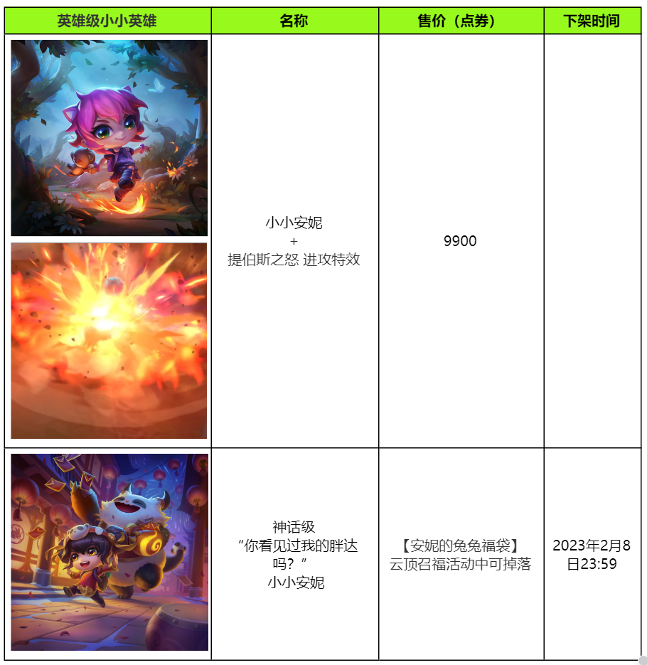 l 消耗灯笼点灯召福将召唤随机小小英雄,平均有2%概率获得“你看见过我的胖达吗?” 小小安妮,有98%概率优先获得春节版本小小英雄;如已拥有全量春节版本小小英雄,则有98%概率获得非春节版本的过往小小英雄。详细小小英雄奖池请见活动奖池。