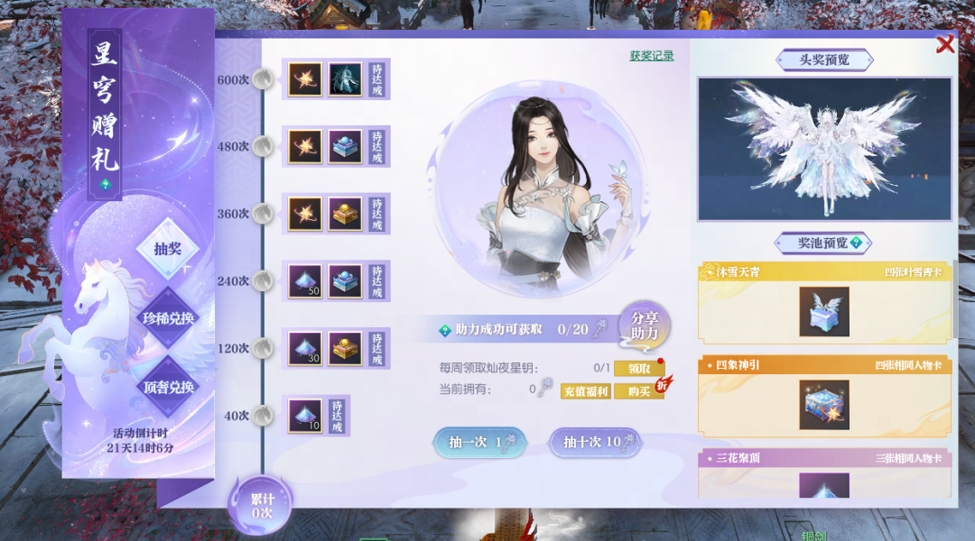 6) 星穹赠礼每周可免费领取1抽,邀请好友助力,最多还可得免费20抽!累积参与一定次数,还可获得【苍龙/金凤幸运散】、休闲动作【星箭湛月】等奖励。