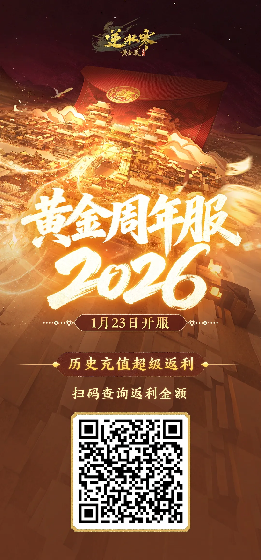 1、黄金服周年新服【2026】将于本周五1月23日14:00开服,游玩即可瓜分300万现金奖励,扫描下方二维码预约锁定席位,组建新服战队吧!