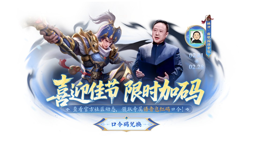 喜迎佳节,红码福利限时加码!2月1日-2月7日,小师妹每天都会在社区官方阵地发放一条“林冲 · 曲敬国”语音包的福利红码,复制对应红码前往游戏内进行兑换即可免费抽取「林冲 × 曲敬国」联动语音包!