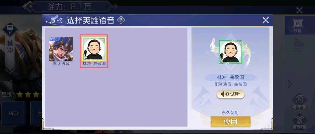 3)在语音选择弹窗内,选择【林冲·曲敬国】语音包,点击【使用】按钮,这样语音包就使用成功啦;