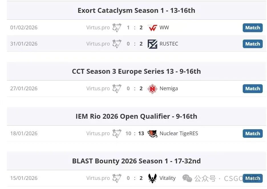 在俄罗斯莫斯科举行的Exort Cataclysm S1于1月31日拉开帷幕,而VP在首日即遭遇惨败,连续负于没有VRS排名、HLTV TOP200的RUSTEC,以及双排名100开外的俄罗斯主播队WW,一轮游出局。