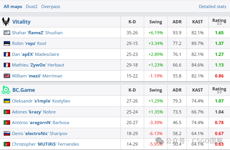 图一Dust2森载大战成了奎仔大战。BC.G赢下手枪局随即被翻盘,长枪局krazy连续发威以5-3反超。但火仔两局9杀,将比分追至5平。依靠电子哥打掉薯薯和ropz完成1V2,BC.G半场领先两分。下半场葡萄牙老头平台泼水3杀,两队又打成7平、8平。但随后大黄蜂抓住对手经济困境连连得手,apEX和ropz又完成2V3守包,Vitality连拿5分先下一城。