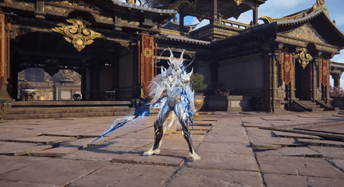通体覆盖冰裂质感的蓝白鳞甲,肩脊与额头处生长出峥嵘的苍玉龙角,瞩目的龙尾不断拖曳,枪身电光环绕。