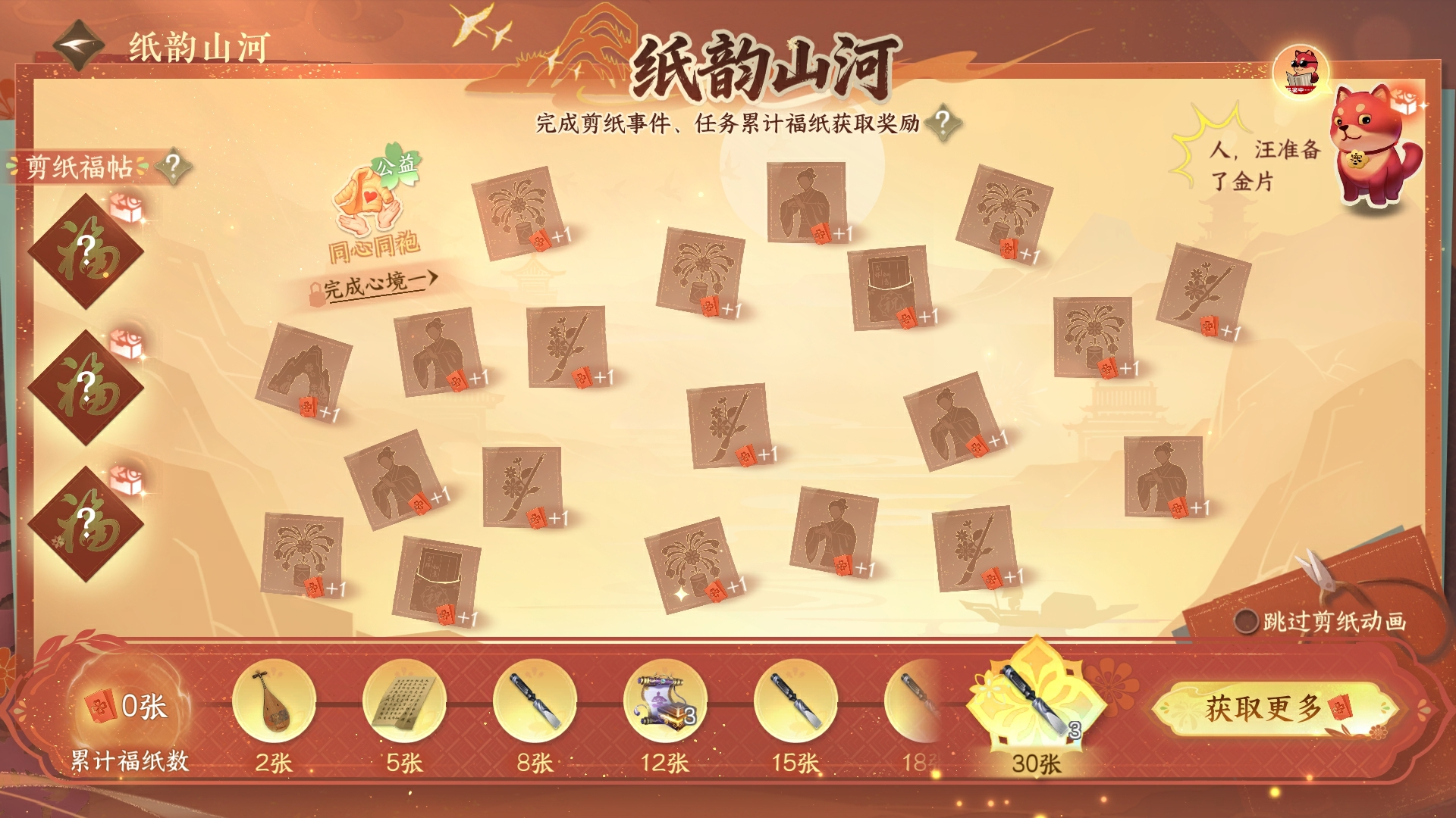 趣玩民俗:纸韵山河活动温情开启,体验传统剪纸技艺,玩转经典民俗 ,将赢取鉴石神凿·绑X7、限定配饰【月抱云琶】、江湖绝技【华灯夜游·上卷】、聊天气泡【寒子顶流】、300纹玉代金券等丰厚奖励。