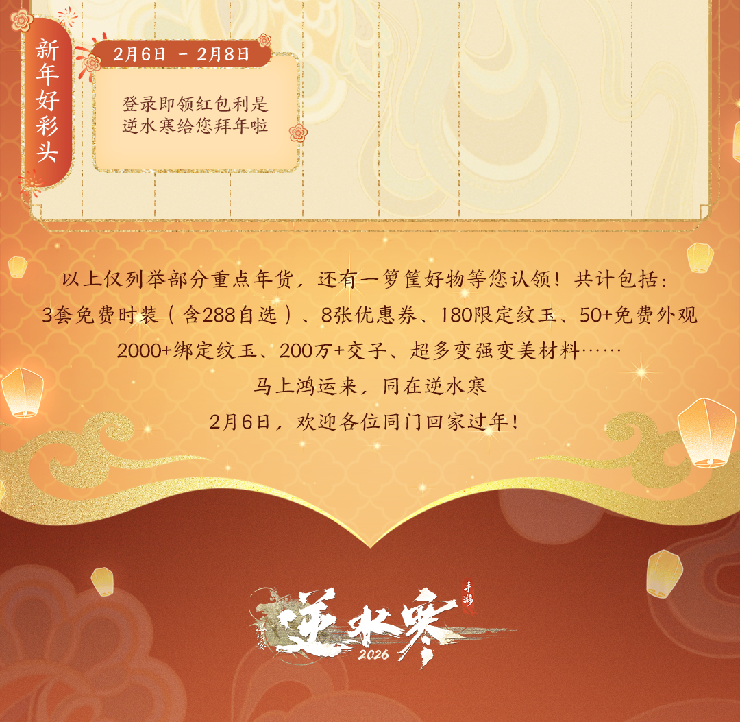 《逆水寒手游》鸿运年2月6日重磅更新!上线领288时装、888万红包、全新流派鸿音上线,泼天福利错过等一年!新春剧情、年兽玩法、罗彩签1抵10,海量年货福利等你拿!