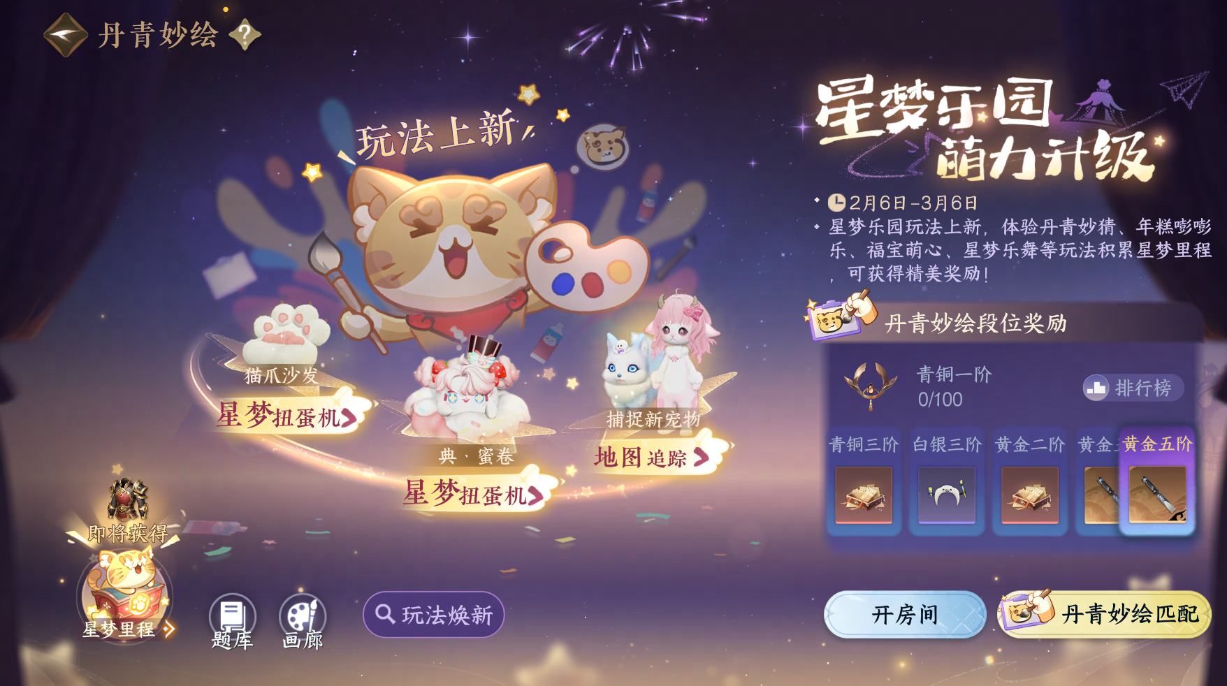 星梦乐园玩法上新,体验【丹青妙绘】累计星梦里程,可获得配饰:百怪千奇、配饰:樱桃旋风、配饰:薄巧蛋糕等奖励。