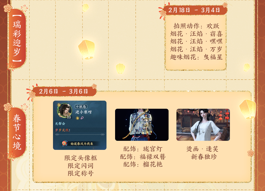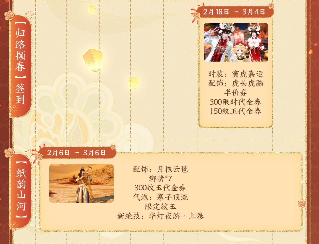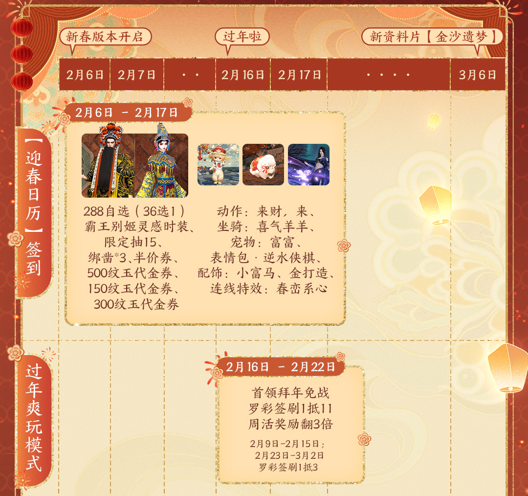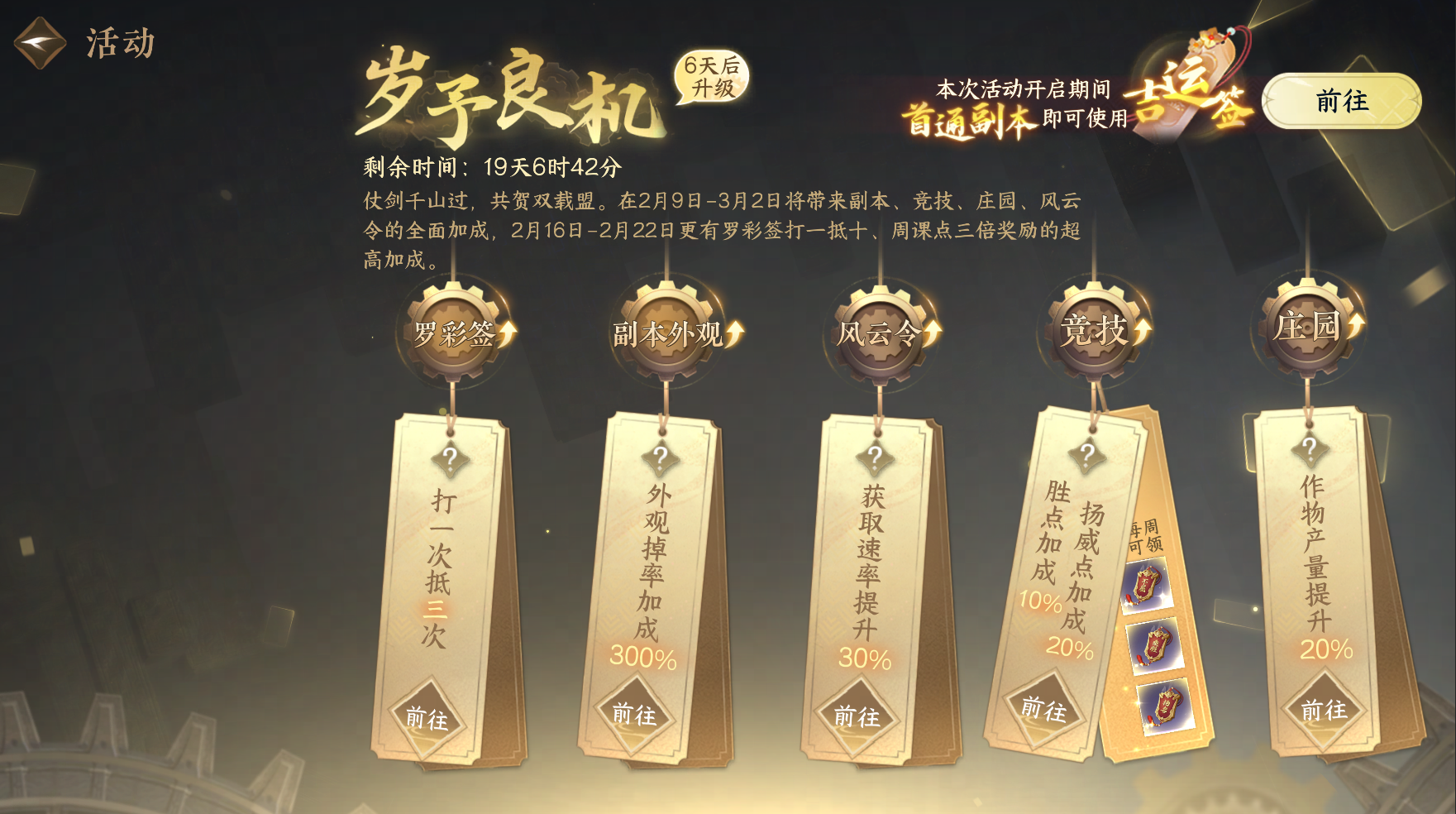 2月9日-3月2日,【岁予良机】活动开启,带来副本、竞技、庄园、风云令的全面加成。 同时新春加码罗彩签打一抵三,副本外观爆率300%,首通boss即可使用吉运签。