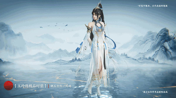 用轻纱改良的白色道袍飘飘欲仙,挂脖款式更加优美修身,衣袖带有宝蓝色环状飘带,八卦光纹悬浮其上,随处可见的精美的云纹如点睛之笔。