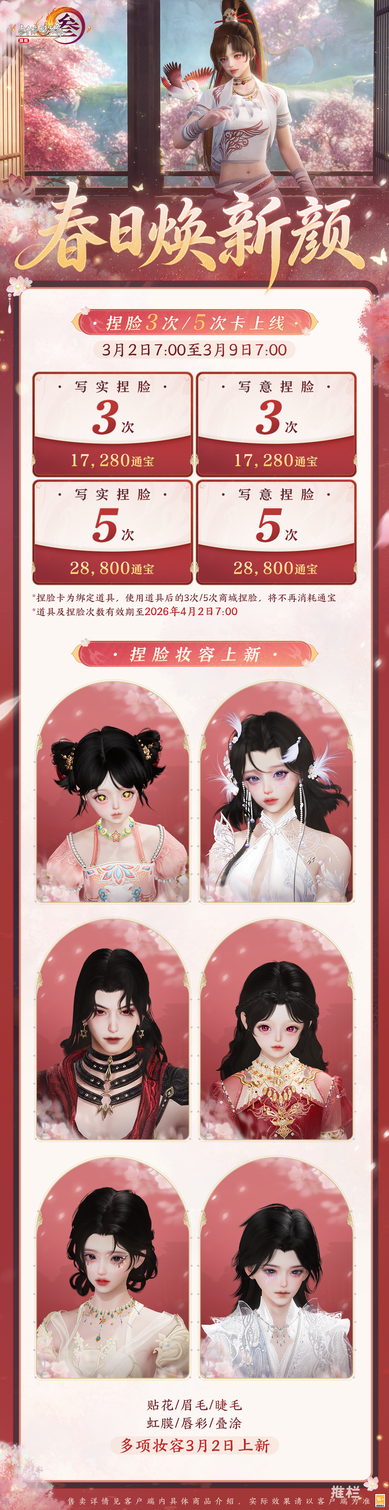 购买【云鬓脂】系列发型染色道具限时享8.5折折扣,超值一口价捏脸卡限时返场!还有多项妆容上新,且趁韶华开胜景,共赴今朝好春光!