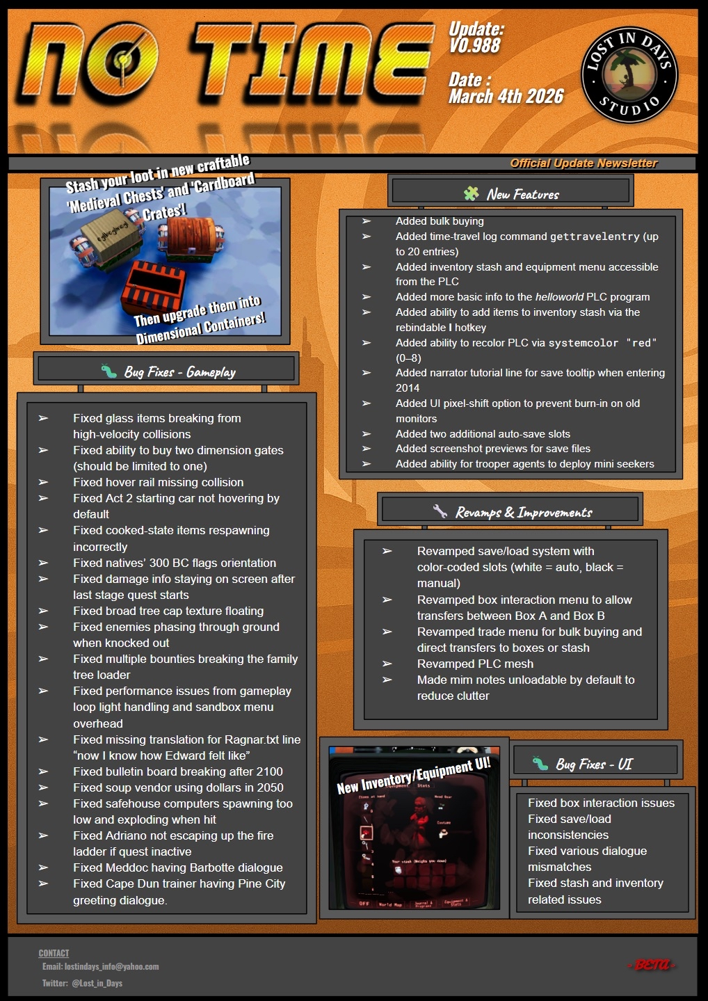 《No Time》V0.988更新:库存交易系统全面重制!新增批量购买、箱子互动、存档预览功能,修复大量错误。体验更流畅的时间旅行冒险!