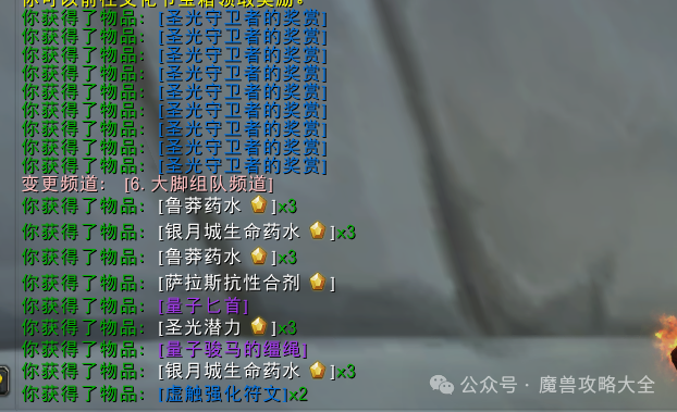 [圣光守卫者的奖赏]:自动分配给自己登录的第一个角色,有几率开出“火焰猫头鹰/驭空术手稿/药水”等等,我反正是没出猫头鹰。