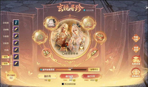 2、每进行20次玄镜寻珍抽奖将自动额外开启一次【福利加赠】抽奖,从奖池内随机抽取一种珍稀外观奖励,每种外观有各自对应的蚀沙金羽数量,抽到时可自行选择外观奖励或蚀沙金羽。