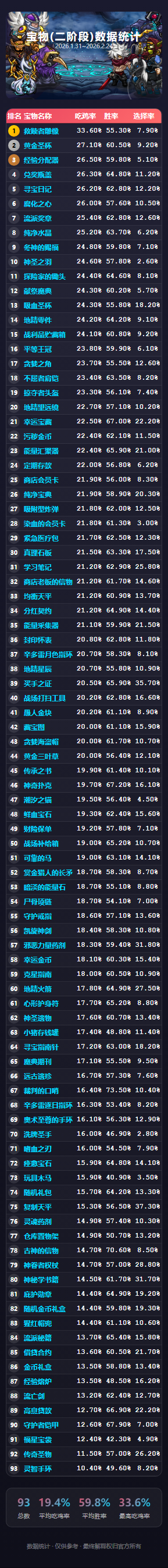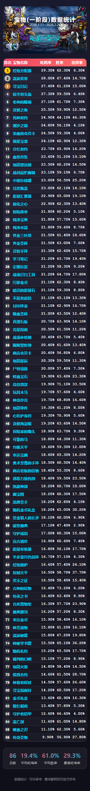 《选技大乱斗》铂金段位玩家宝物数据统计,揭示高胜率宝物选择策略,助你快速上分!查看详细图表分析。
