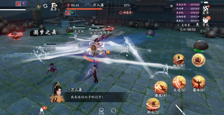 场边的每个酒友都会提升万人屠的伤害,酒友每隔一段时间就会试图摧毁场上的坛子,引导万人屠的大风大浪技能朝向,将油坛击飞到酒友身上。