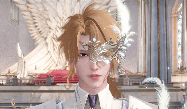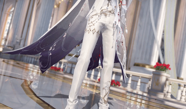 领口的紫晶领带如夜色般深邃,腰侧垂落的红晶坠饰,像是夜空中悄然滴落的星尘,诉说着无声的邀约。与面具呼应的银白羽饰,更是藏着浪漫隐喻,只待向你伸出手,共赴一场月光圆舞曲。