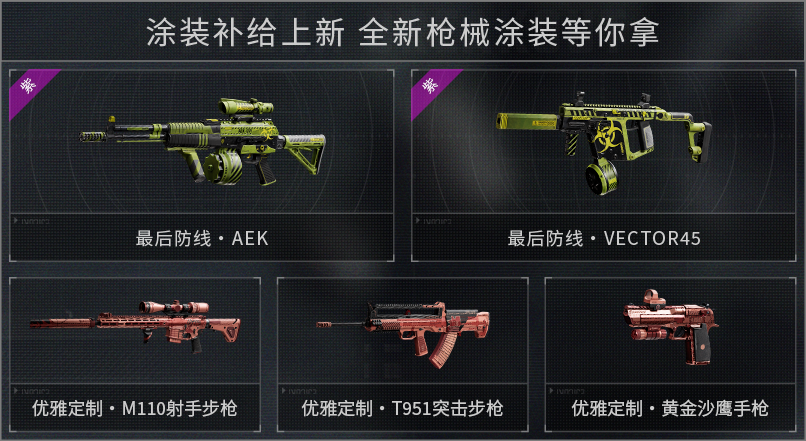 4.枪械涂装补给上新,全新主题挂饰等你来抽!枪械涂装补给新增【最后防线】、【优雅定制】主题枪械涂装,全新不灭朋克主题挂饰来袭,完成日常任务与限时活动即可获取涂装补给券与挂饰奖券即可免费抽取,期待各位先锋的参与。