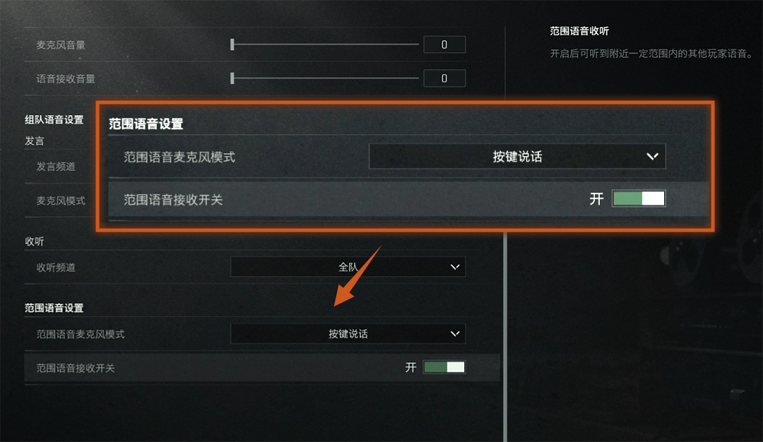 你现在可以与附近的非队友玩家进行实时语音交流,可自行在设置中自由开关。在此前体验服的基础上,我们还增加了范围语音对3D位置的支持,是协作、博弈,还是进行整蛊行为,全由你自己决定。