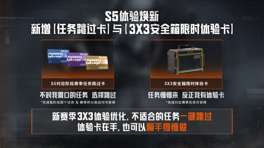 S5赛季,我们对赛季任务体验进行了持续打磨,新增了【任务跳过卡】,完成每阶段首个任务或通过赛季积分商店购买均可获得对应阶段的跳过卡,不对胃口的任务直接跳过;同时,完成对应赛季任务还可获得【3×3安全箱限时体验卡】,体验卡在手,赛季任务顺手慢慢做也不迟。