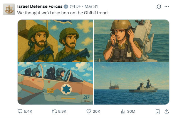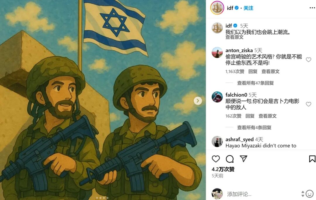 以色列军方于3月31日(日本时间)发布了四张AI图像,并配文“我们决定加入吉卜力潮流”。