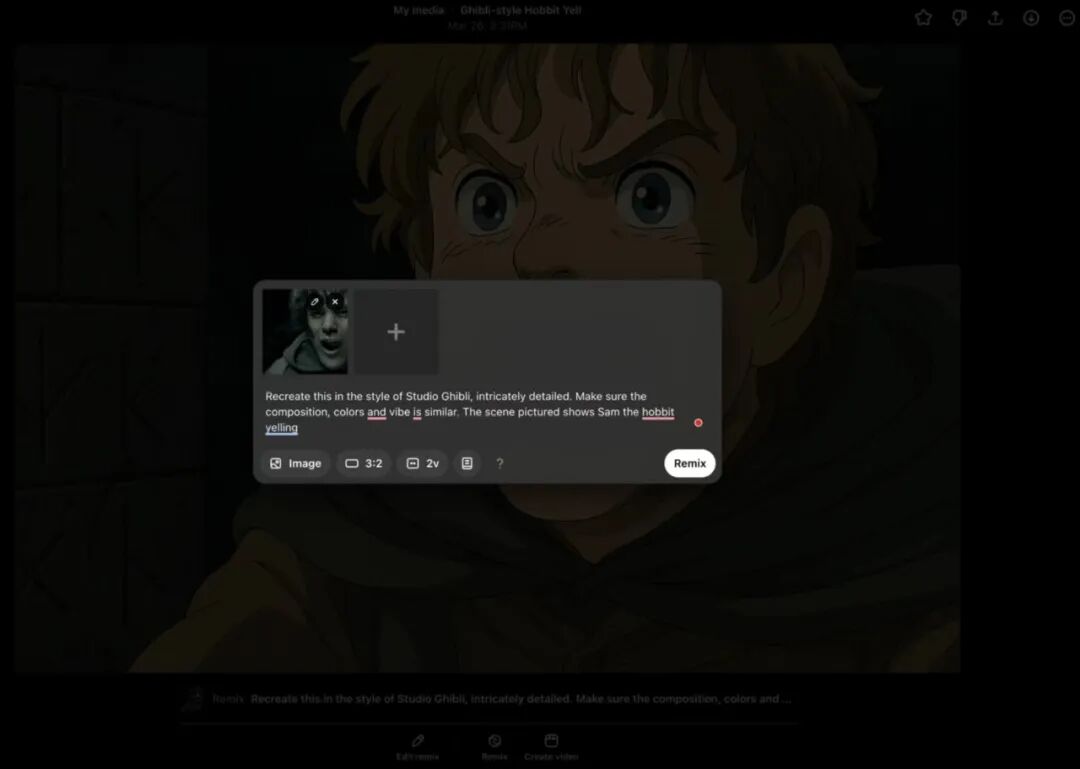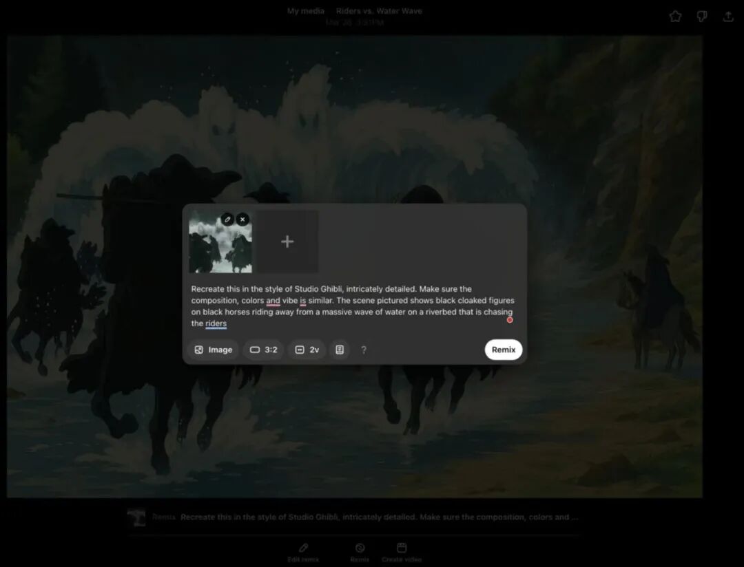 在 Sora 中,他对AI下达了非常具象化的提示:以吉卜力工作室的风格重现这一场景,细节精致。确保构图、颜色和氛围相似。图中场景显示,身穿黑色斗篷的人物骑着黑马,逃离河床上的巨浪,而河床正在追赶骑手们。
