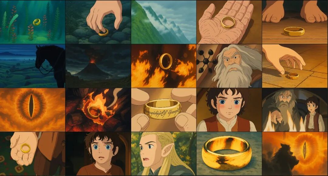 PJ截取了《指环王》预告片里的102个镜头,之后在Sora中重新混合成吉卜力风格。