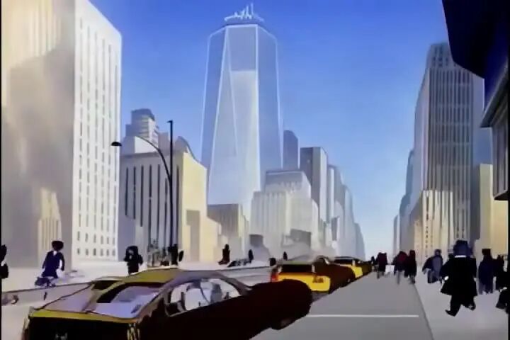 世贸中心双子塔巍然屹立,映衬着清晨湛蓝的天空。街道上西装革履的行人熙熙攘攘,黄色出租车在车流中缓缓穿行。阳光从附近建筑物的玻璃窗反射出来,十分刺眼。蓝灰色的猫汤姆手里提着一个黑色的公文包,沿着宽阔的灰色人行道轻快地走着。