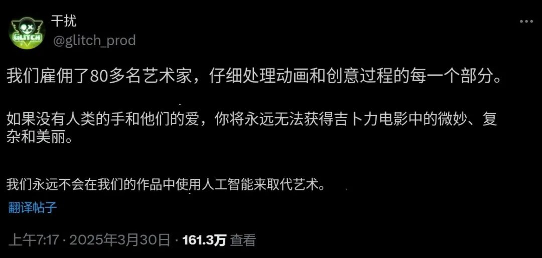 3月30日,澳大利亚动画公司Glitch Productions紧随其后发布声明,“我们永远不会用AI来取代(人类的)艺术创作”。间接回应了“吉卜力化”的争议。