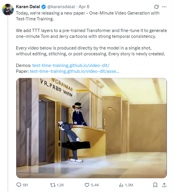 原文:今天,我们发布了一篇新论文——《通过测试时训练实现一分钟视频生成》。
