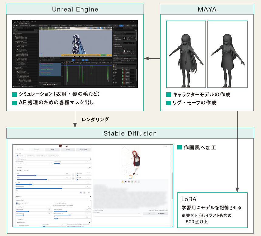 三者的顺序也是层层递进,基本资产是在Maya中创建的,动画场景是使用虚幻引擎构建,经过渲染后,使用LORA进行整合。