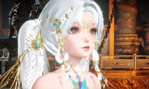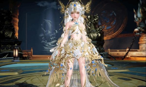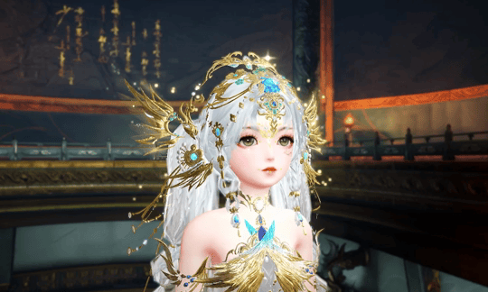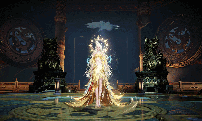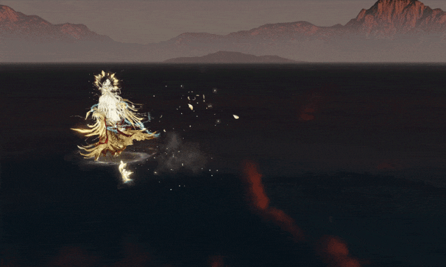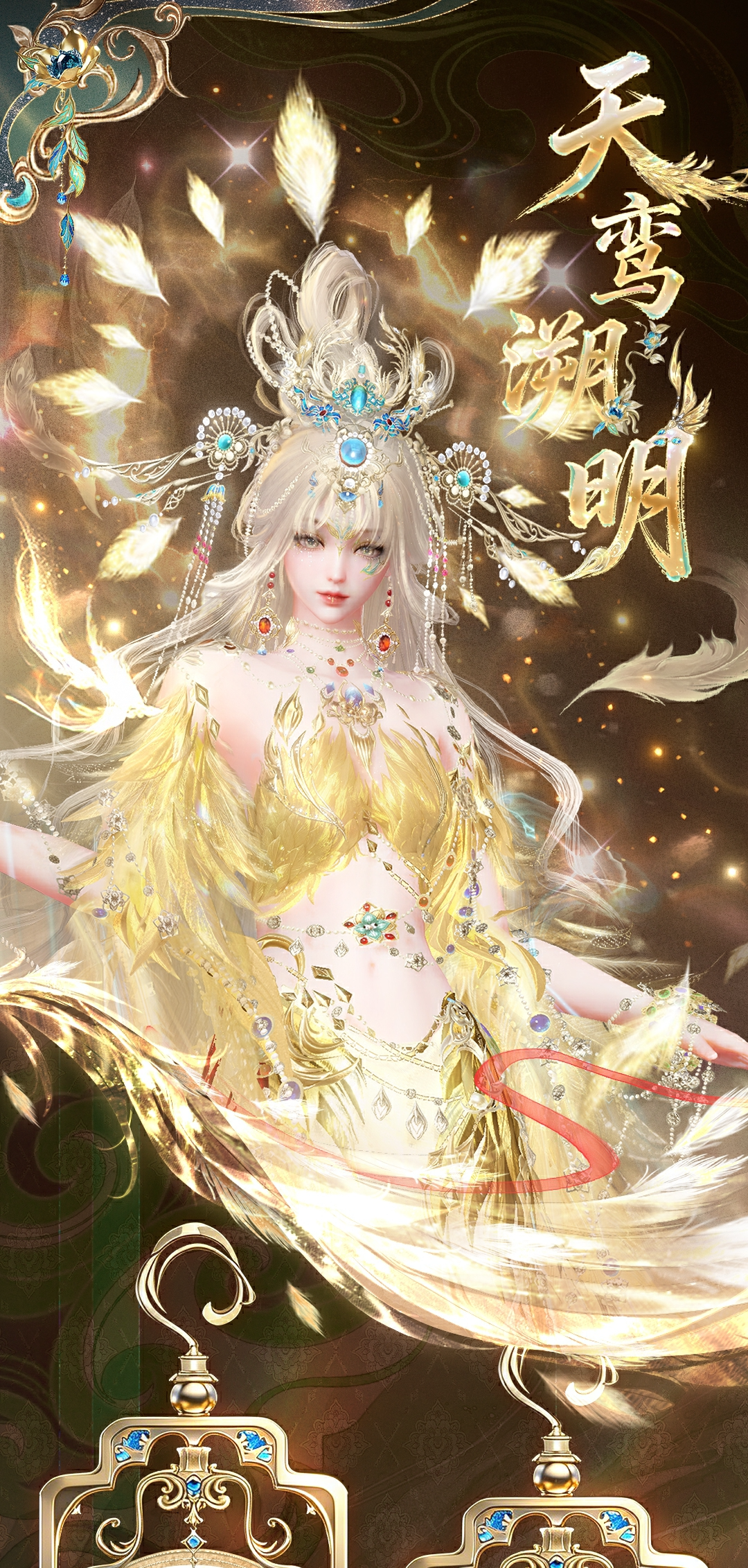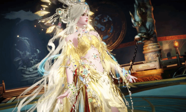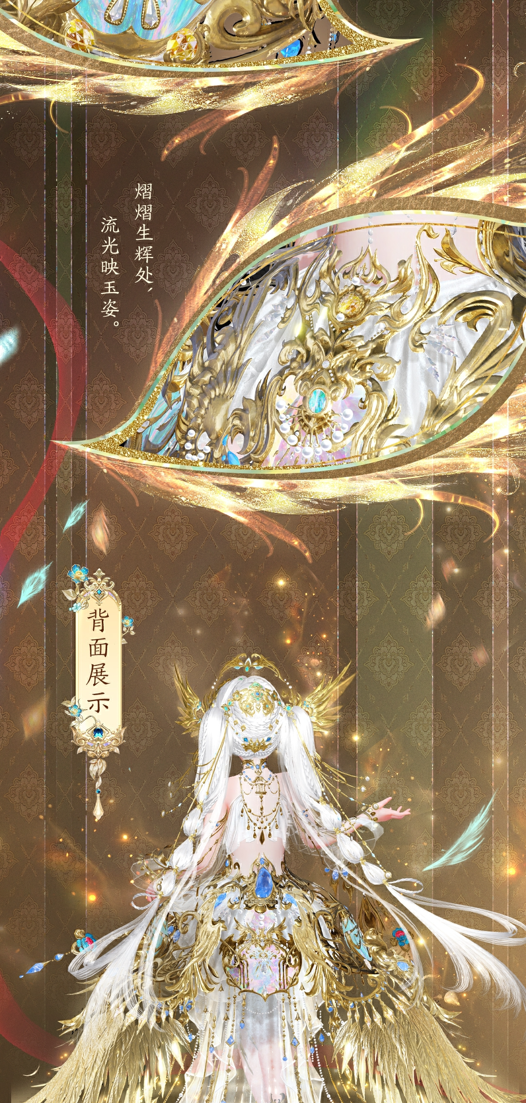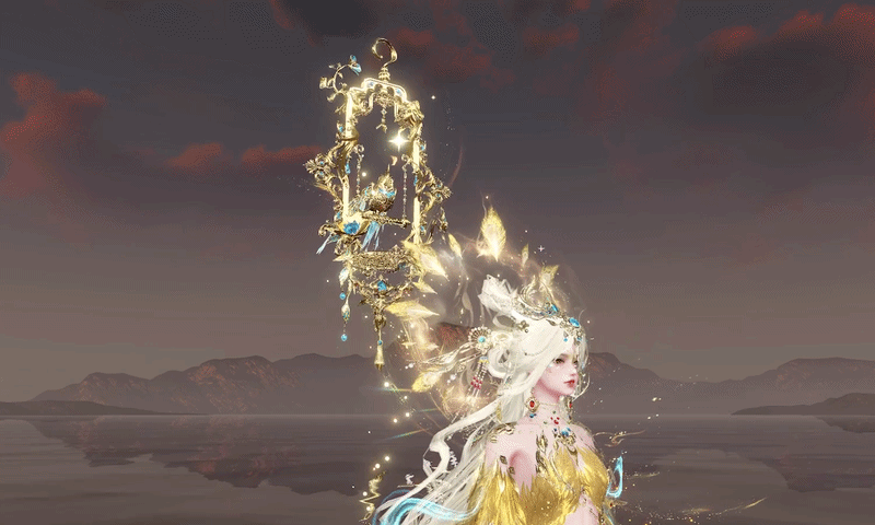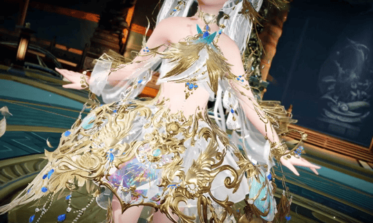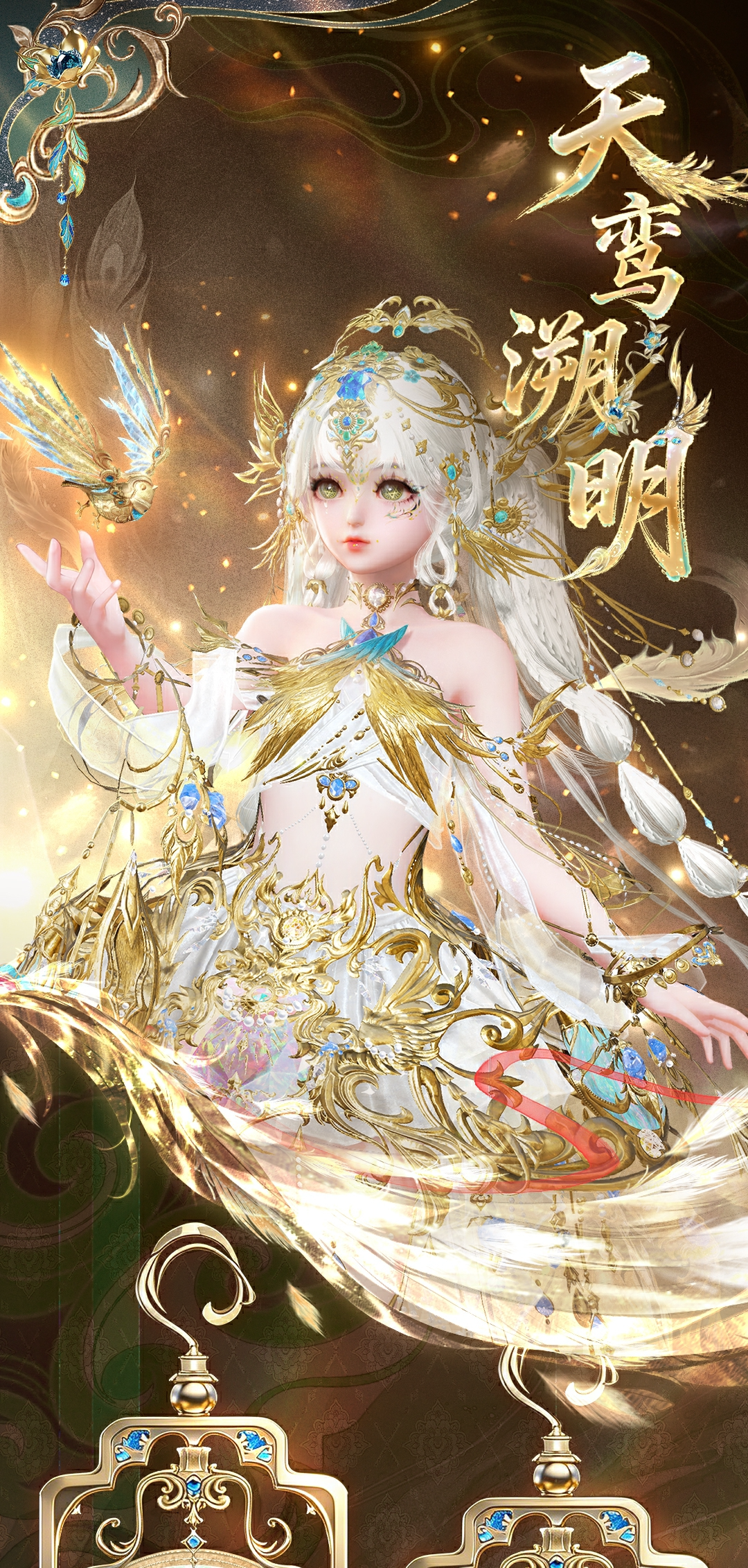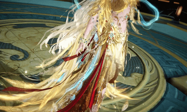 少女款则是天鸾神鸟的【雏鸟】形态,色彩上更加明丽,鸾鸟元素被解构成了华丽的金羽配饰,缠绕在衣袖和裙边。金属与琉璃相间点缀于裙摆,如同清晨挂在羽毛上的露珠,晶莹剔透。两侧垂下黄金羽翼,俏皮地扇动着。裙身点缀的青蓝色宝石,是夜莺一族最珍贵的信物。