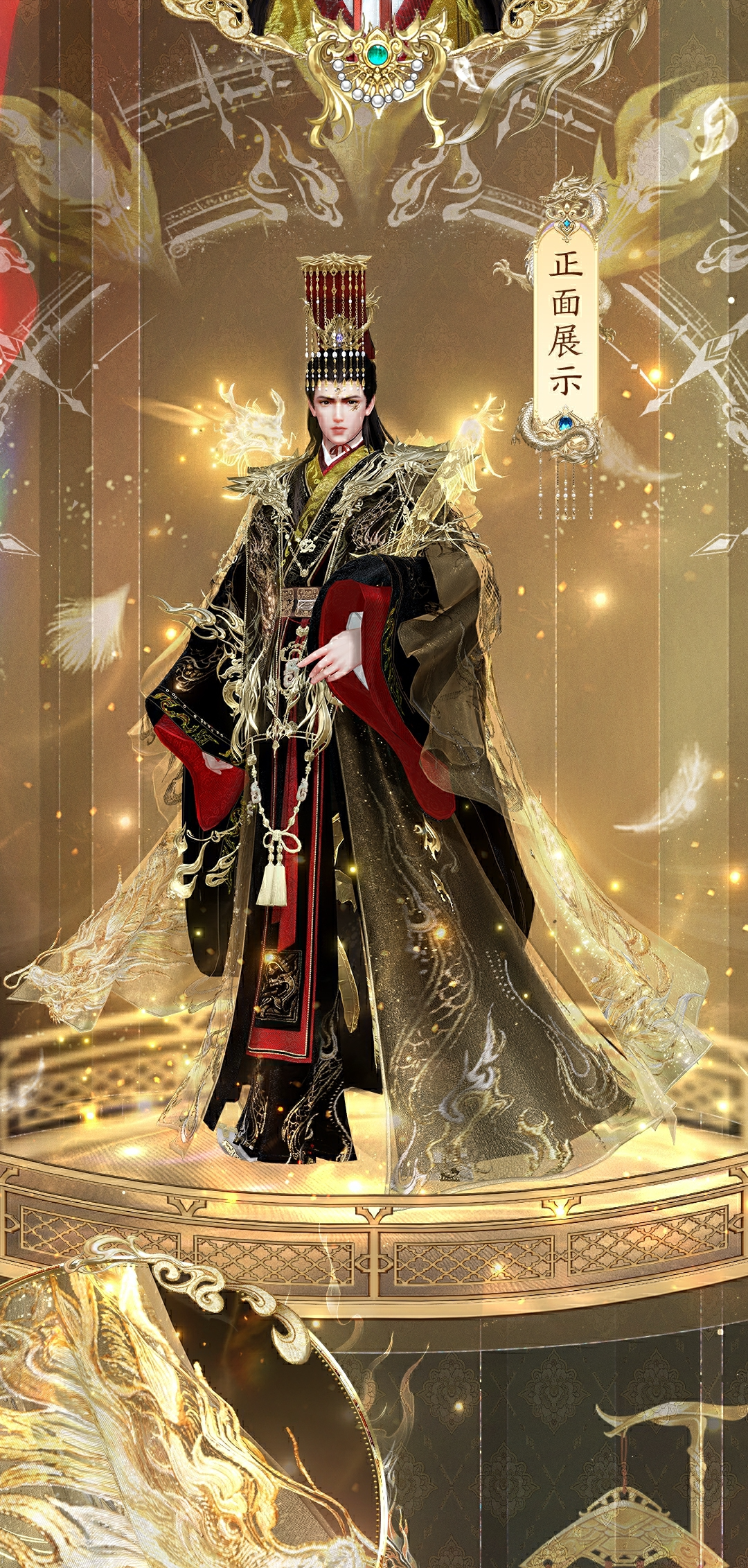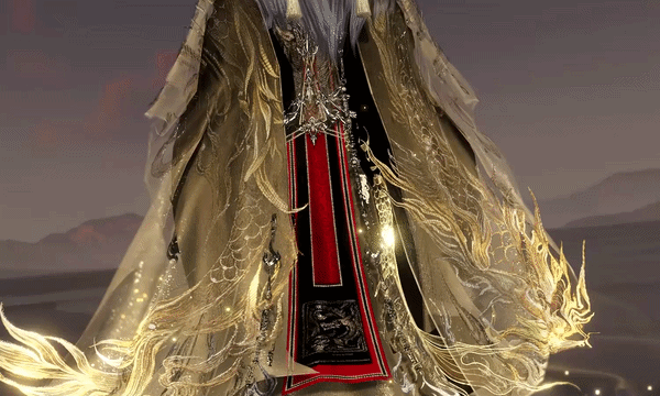 以【王权】为核心,将帝王的威严与孤高藏进了每一寸玄黑的袍服里。鎏金龙纹自肩颈蜿蜒至衣摆,仿佛有真龙护体,威慑八方。肩上更铸有金属龙形甲胄,宣示着不容侵犯的王权。腰间束以精致腰封,垂下的织锦上隐约可见龙纹,彰显其血脉的尊贵!