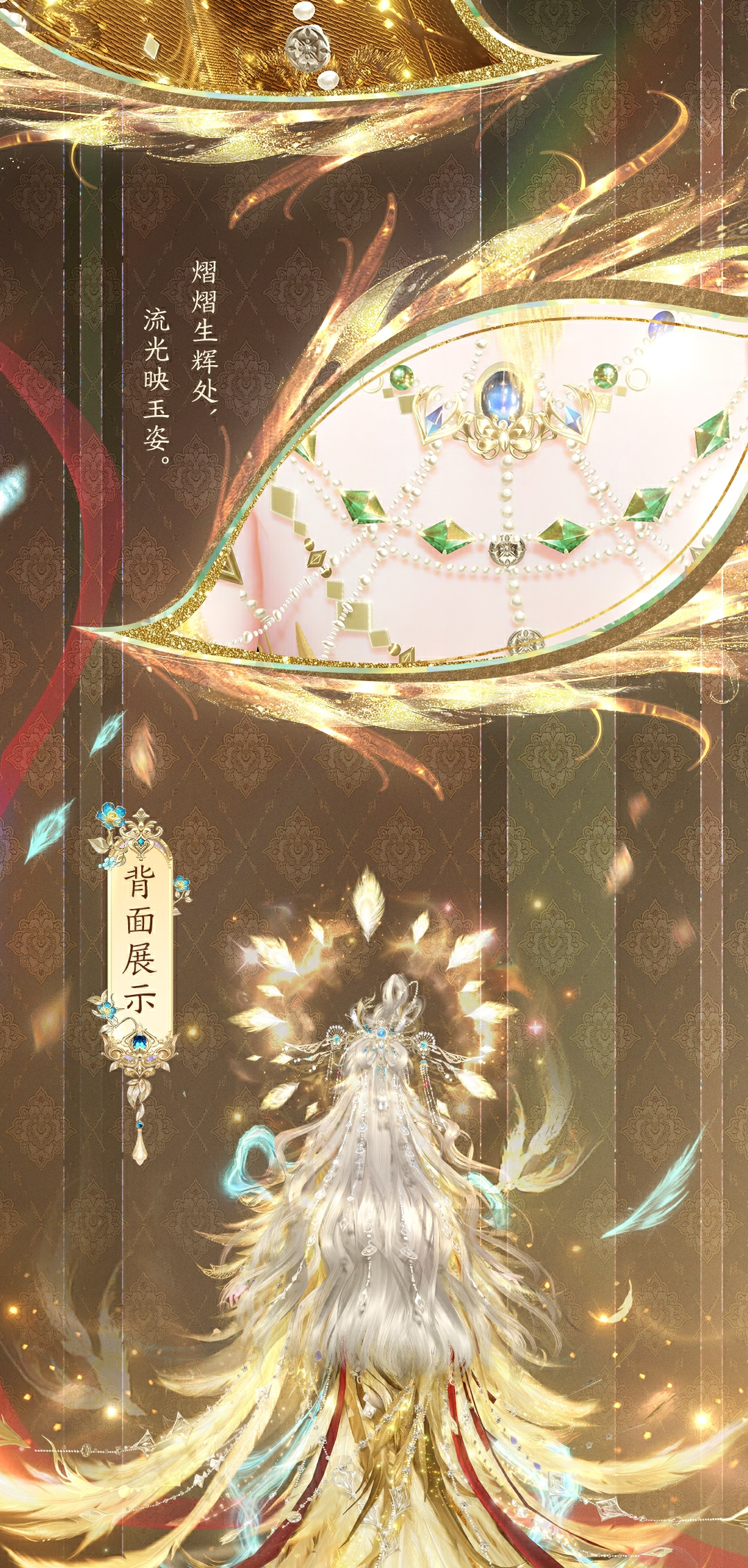 以华丽的鎏金羽毛为主要元素,裙面上的纹样取自《山海经》中对鸾鸟"五彩备举"的描述,以手绘感的金丝刺绣呈现,每一笔都像是从古卷中拓印而来。羽毛点缀着细碎的金箔,行走之间,流光闪烁,仿佛夜莺振翅时,从羽翼间洒落的万点星光。万丈金光曜如白昼,其神姿雅韵引得万民景仰!