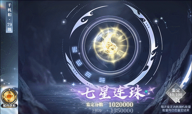 3) 自选三个千机扣部件开始合成后,将拥有100点鉴定能量,每次鉴定消耗随机数值的能量,并提高千机扣评分和评级。鉴定能量耗尽后确定千机扣的最终评级,评级越高,千机扣的品质、白字属性、词条数量、词条数值都越强。