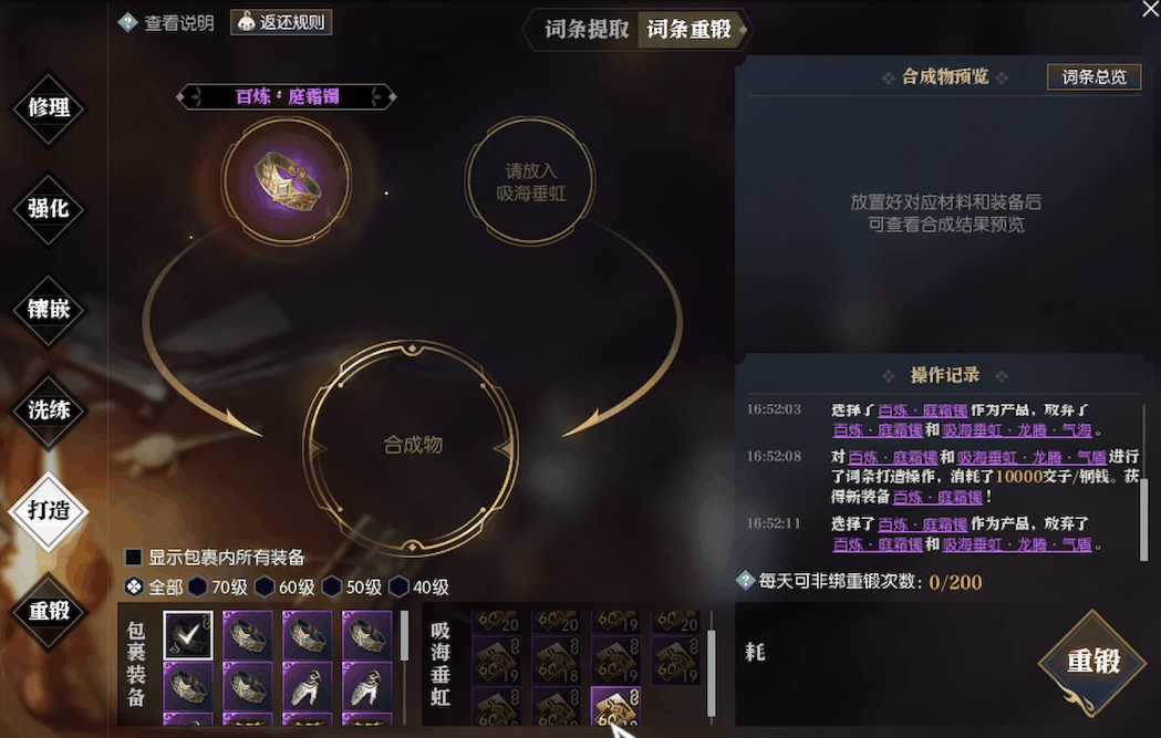 2) 获取途径:同门可通过完成扬名之路任务、挑战凌霄塔、同心双修等级奖励,获得三张5星龙必上券(星辰/龙腾自选),在词条重锻4上5时加入该物品,必定一次成功!