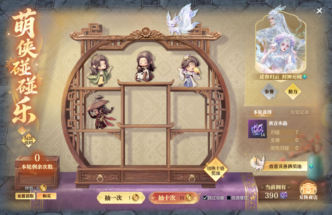 2) 活动期间消耗【萌侠币】即可参与萌侠碰碰乐抽奖,产生对碰、全清、金色对碰可获得【幻言晶辇】、【发型·月昙】、【环身·祈望星潮】、【背饰·苍澜浮光】或一定数量的【真言水晶】。活动期间首次十连抽免费,后续抽取需消耗【萌侠币】,可前往艮岳商城购买,也可参与充值活动获取!