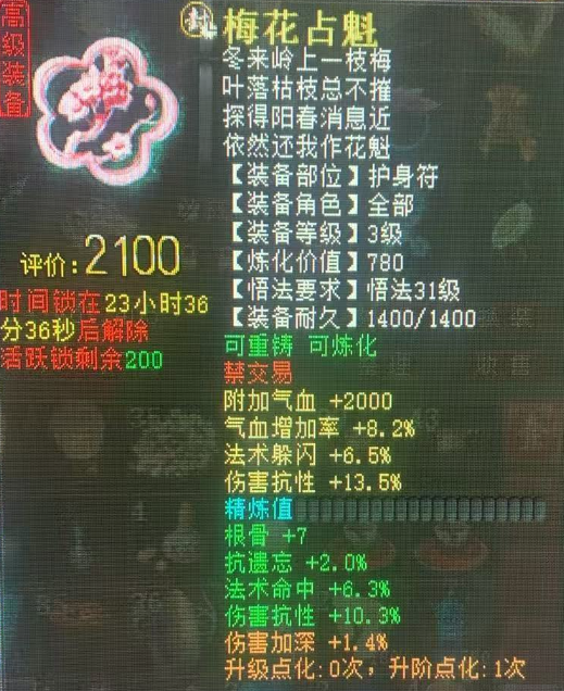 极品3级高装护身符,炼化法术命中6.3+伤害抗性10.3,命中伤抗双管齐下。(素材提供:剑雨花海-乱世教父)