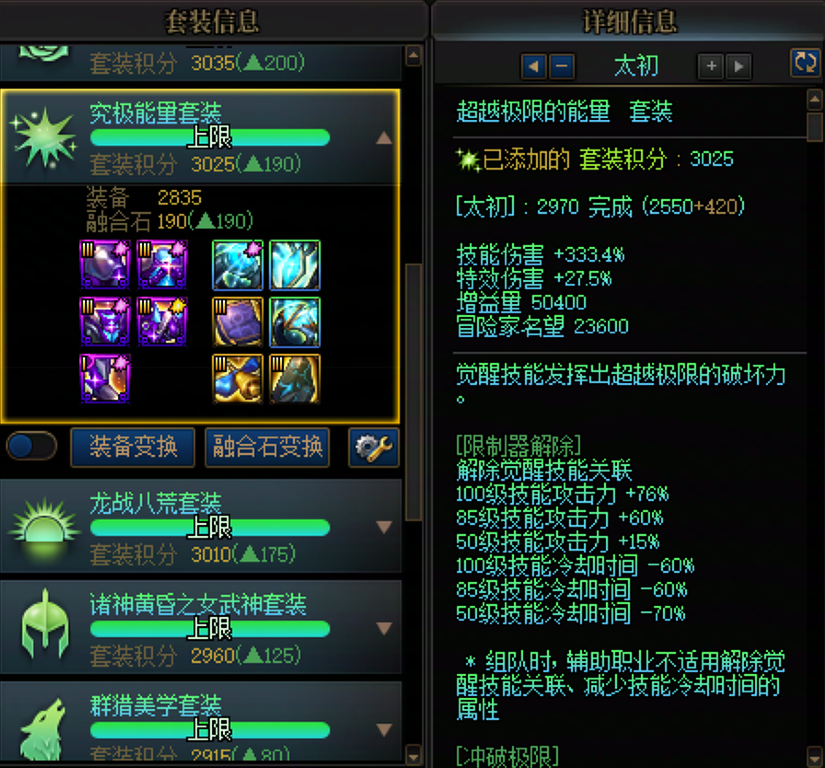 在重力之泉版本,所有套装的属性都是固定唯一的,究极能量套也不例外——它就是纯粹的觉醒特化套装,主打觉醒爆发伤害,玩法单一,只有极致追求觉醒爆发的玩家才会选择,绝大多数职业都只能望而却步。