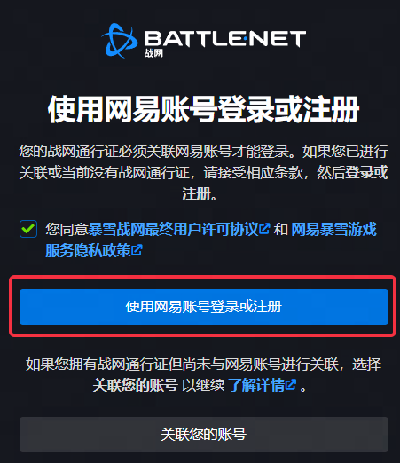 1、进入战网官网,勾选同意协议后点击使用网易账号登录或注册。