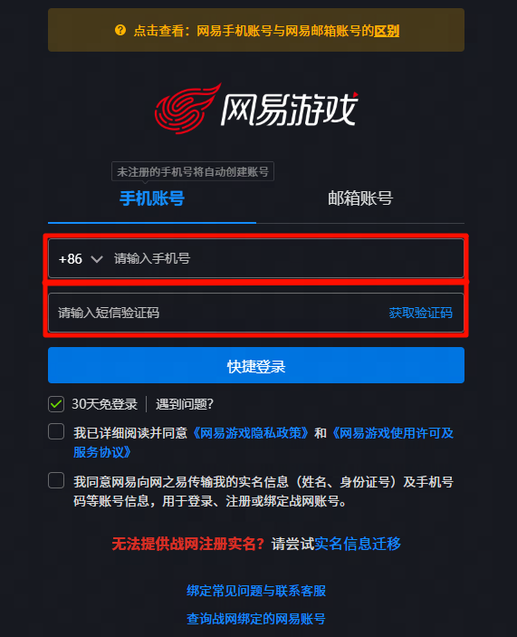 2、登录已有的网易账号;如果没有,请输入个人手机号并填写收到的短信验证码。