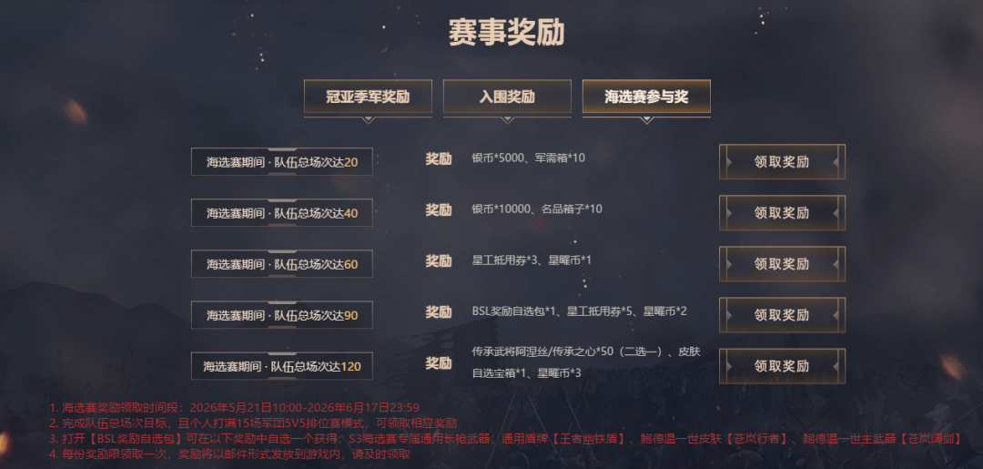 在本届赛事海选阶段,队伍打够一定场次的比赛,可获得BSL奖励自选包、传承武将阿涅丝/传承之心*50(二选一)等奖励。