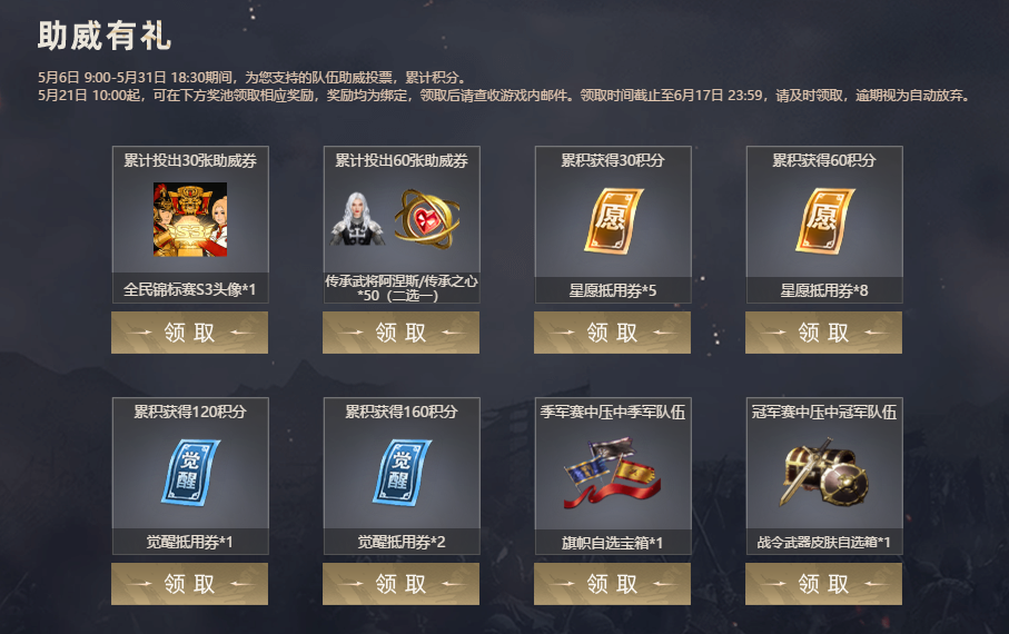 累计获得60张助威券,5月21日后可领取鲍德温四世传承武将阿涅丝。同时,满足条件还可获得【全民锦标赛S3】限定头像、星愿抵用券、觉醒抵用券奖励。
