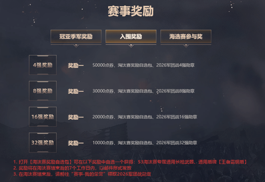 若队伍成功入围淘汰赛,根据最终队伍名次,还有海量点券、淘汰赛奖励自选包、2026军团战勋章奖励。
