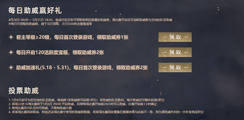 完成每日登录游戏、开启120活跃度宝箱等任务,均可获得助威券。5月6日后还会开启赛事竞猜模块。为您支持的队伍呐喊助威,竞猜成功还有额外奖励!
