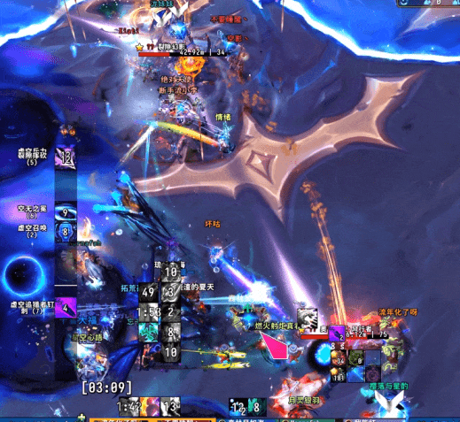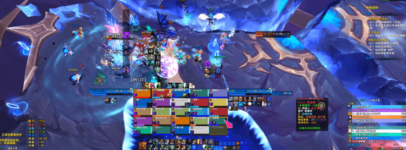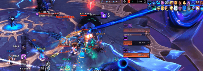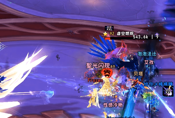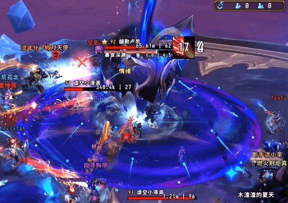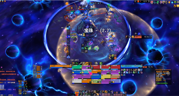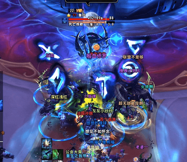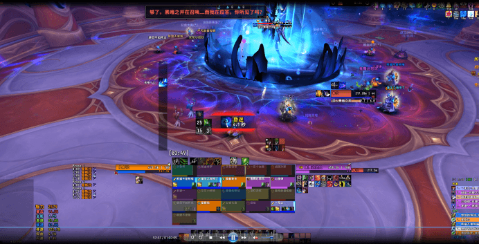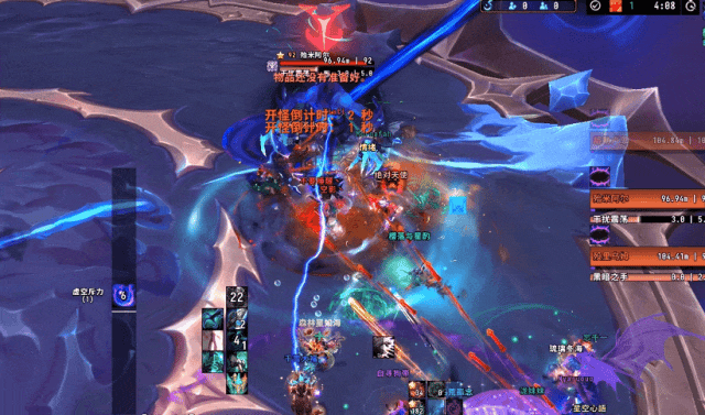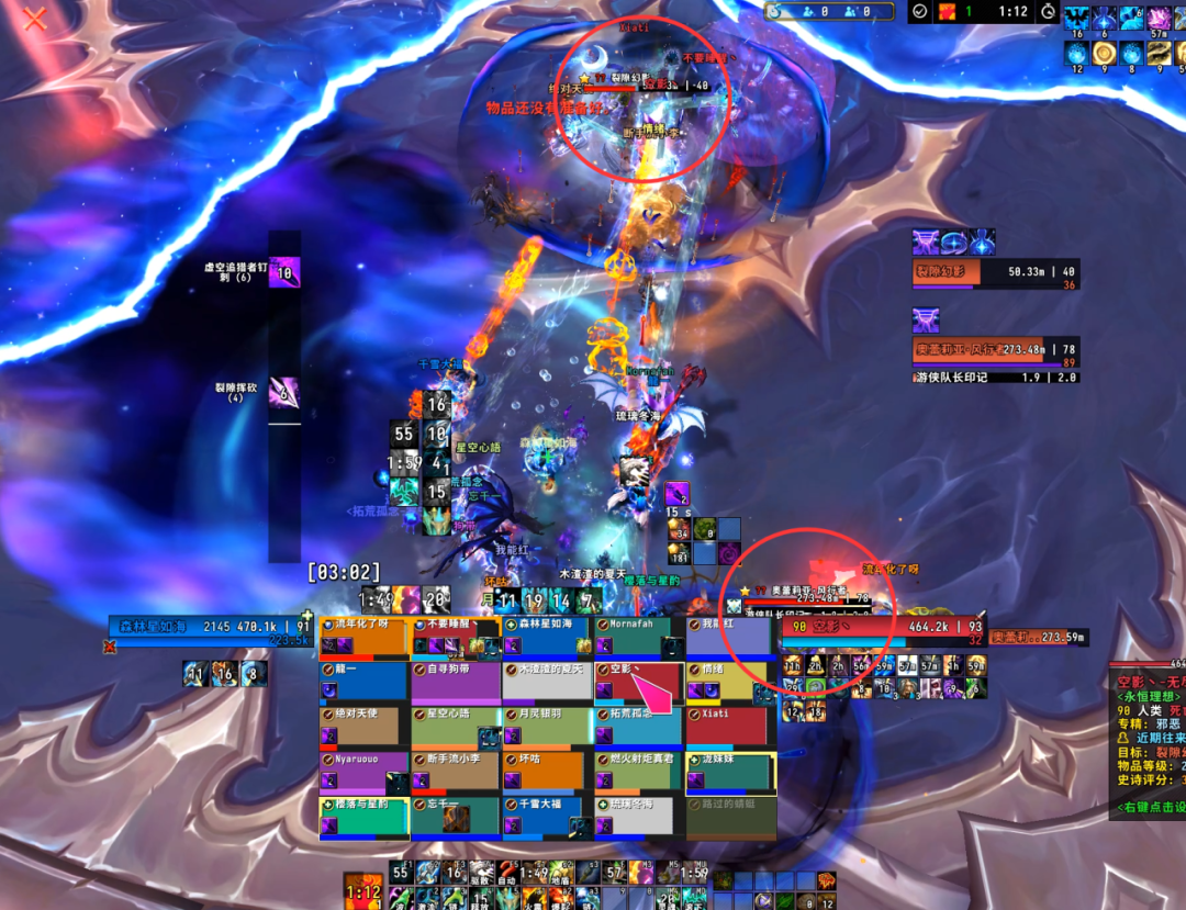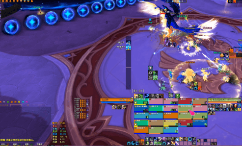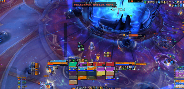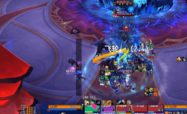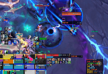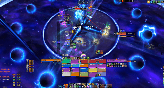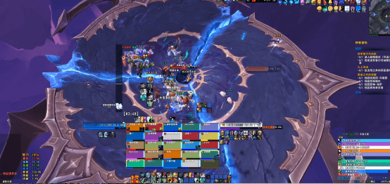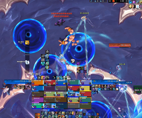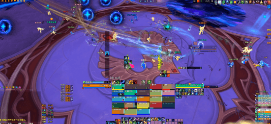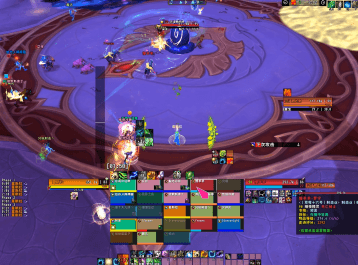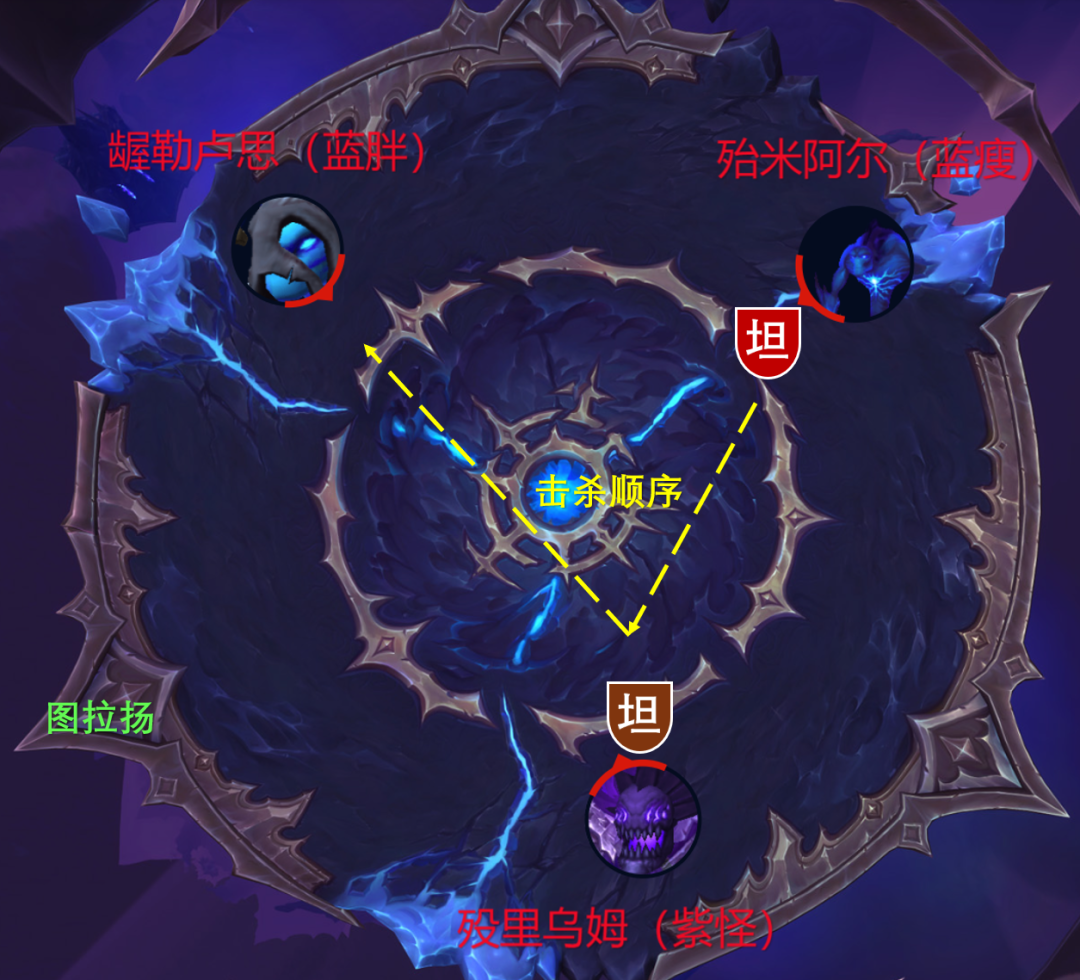 根据大怪无法离开传送门25码的特性,我们制定了第一阶段的战术:两个坦克分别扛蓝瘦(打断施法)和紫怪(击飞坦克),让蓝胖自己在角落玩15码AOE;等蓝瘦被击杀,由扛蓝瘦的坦克去扛蓝胖。