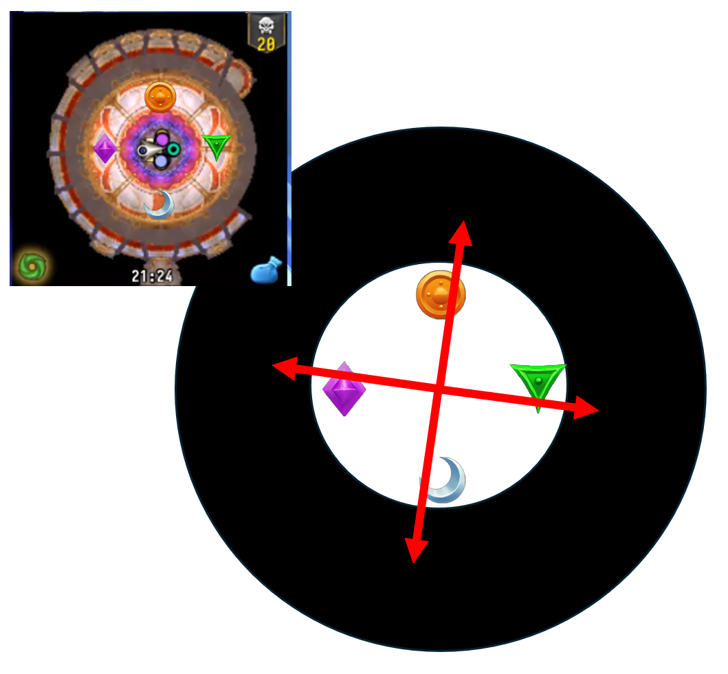 如下图,我们按照小地图的12点、3点、6点和9点四个方位,提前在场上设置四个光柱。